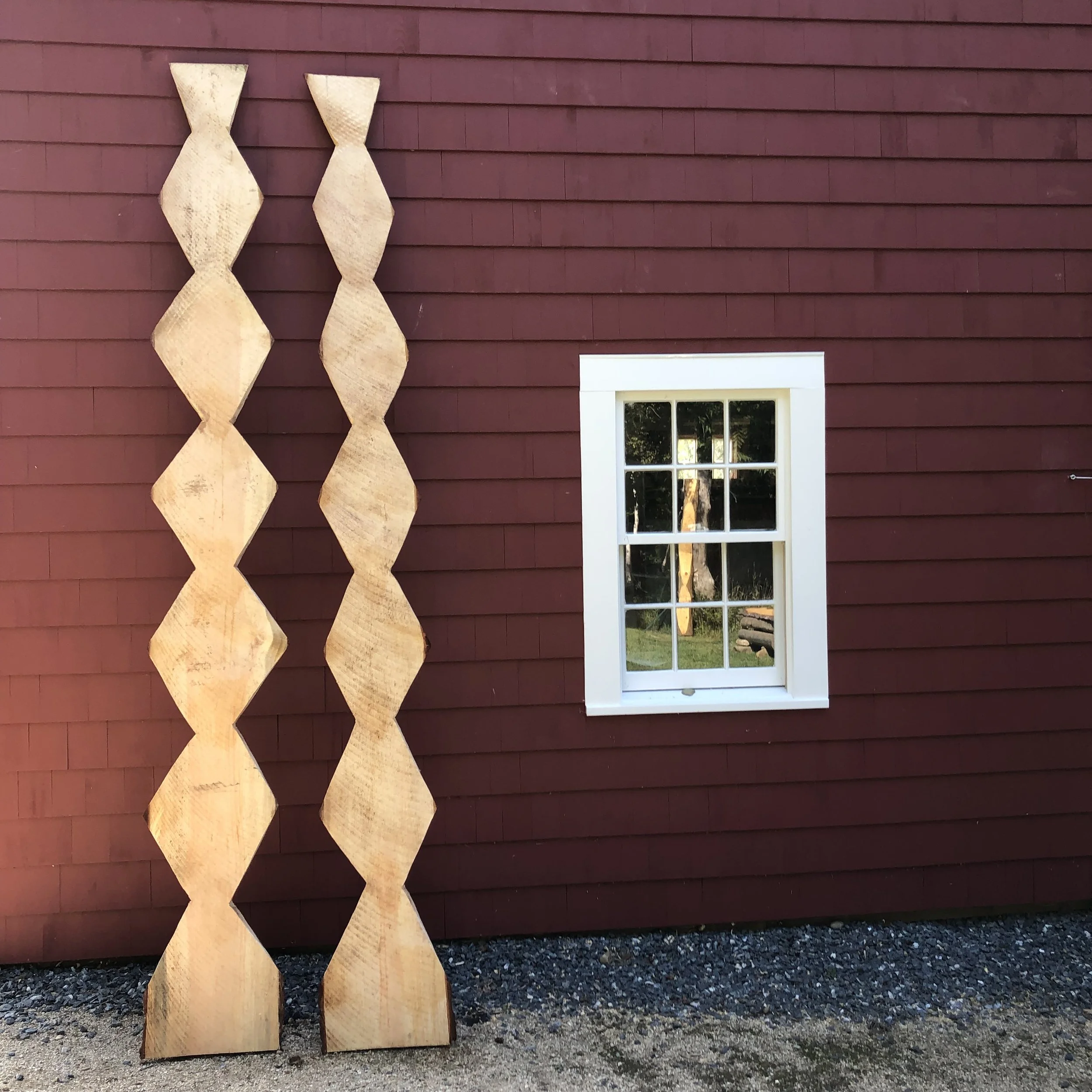 Zig-Zag Flat Columns at Stonington, Maine barn. (spruce slabs, bark on back).